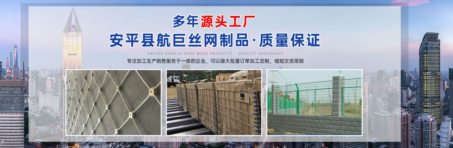 安平縣航巨絲網制品有限公司位于富有“絲網之鄉”美譽的—河北安平縣,此地是世界上最大的絲網集散基地,是華北平原上一顆璀璨的明珠。地處京、津、石三大城市中間,交通便利,是一家集生產,加工,銷售為一體的大型絲網廠家。本廠專業生產各種類型的絲網,類型齊全,主要包括:格賓石籠網,雷諾護墊,麥克排水墊,加筋麥克墊,市政護欄,防爆籠,主動防護網,被動防護網,電焊網片,鋼格柵板等產品,形成了針對邊坡支護、基坑支護、山體邊坡綠化、鐵路、高速、公路、江河、堤壩及海塘的防沖刷保護以及水庫、河流截流等不同行業、不同規模、不同應用的絲網產品和針對性解決方案,是國內最有影響力的絲網產品供應商。技術指標達到國家同類產品標準,可以接受較大的定單并保證質量和生產期限。 公司始終堅持誠信為本、質量第一、客戶至上的經營理念,本著互惠互利的精神,希望與國內外朋友共同合作,為您提供優質的產品和服務。我公司在創新管理中求發展、創新經營中求生存。把企業標準化管理、定額管理、計劃管理,公司十分注重把握市場經濟的信息脈絡,用現代網絡技術,以科研開發為原動力,與科技院校及相關專家密切合作,共同研制開發21世紀適用顧客需求的相關產品。 安平縣航巨絲網制品一直是以“質量精良,交貨及時,價格合理,服務周到”的宗旨來為廣大客戶服務;并且本著“質...